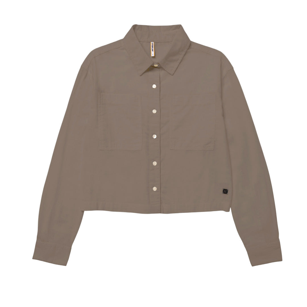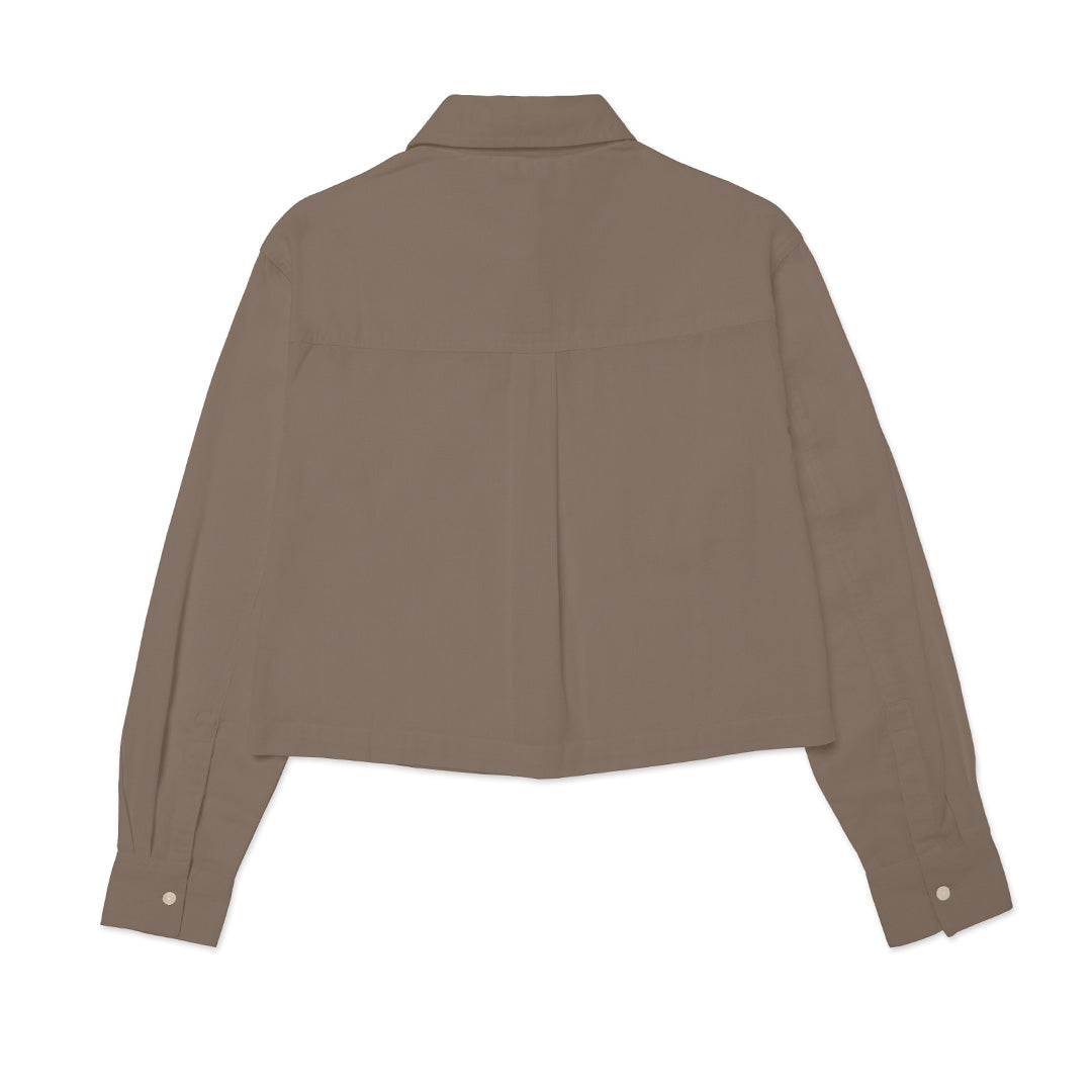Camisa ligera de manga larga, ideal para combinar en capas, con corte cropped, bolsillos en el pecho y botones perlados que aportan un estilo moderno y funcional. Placa con logo Cat® en el frente izquierdo cerca del dobladillo.