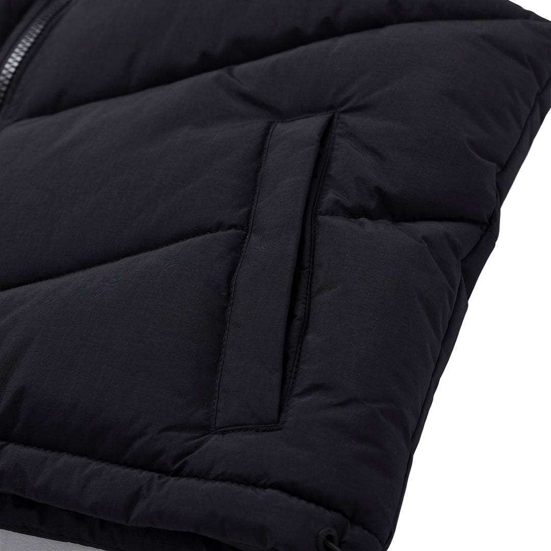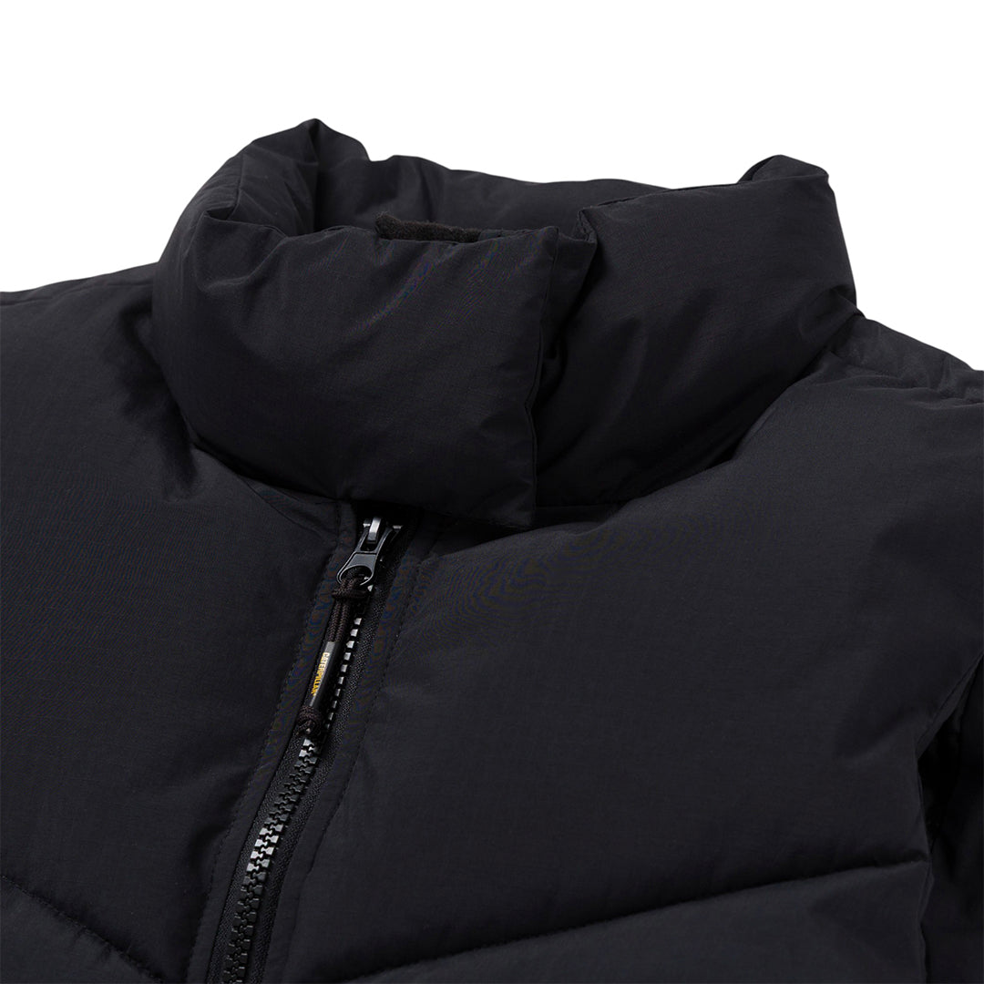Chaleco puffer cropped diseñado para proteger del frío sin volumen excesivo, con bajo ajustable, cremallera central con solapa, núcleo aislante, bolsillos con cierre y forro con logo Caterpillar®, con parche de silicón Cat® en la nuca.
